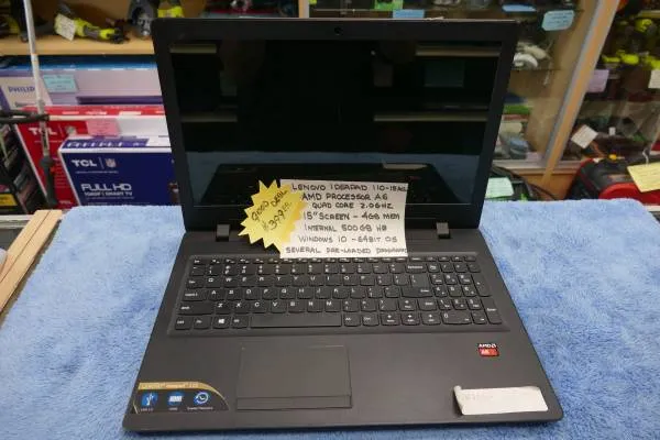 Pre-Owned - Very Reliable Workhorse Lenovo Laptop - IdeaPad 110-15 ACL AMD Processor A 6 - Quad Core runs at 2.0 Ghz 4 Gb Internal RAM Memory - 500 Gb Hard Drive 15 Bright Scratch Free Screen - Windows 10 - 64 Bit Ver OS Several pre loaded programs are on Hard drive - Yours to delete or keep Dark Grey color - Solid Feel Keyboard - USB 3.0 and HDMI Equipped Item is available locally - Pembroke Road exit 19 - 4 Blocks East Asking $399 Cash or Card or best offer ..please call my land line for more info. phone> 954-926-0151 NO EMAILS or Texts