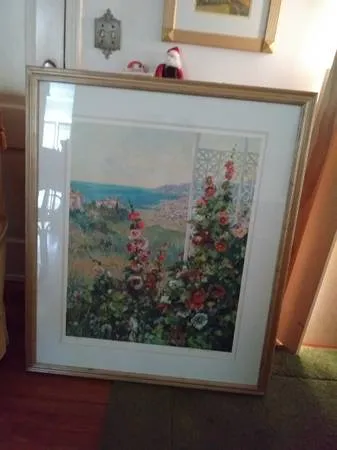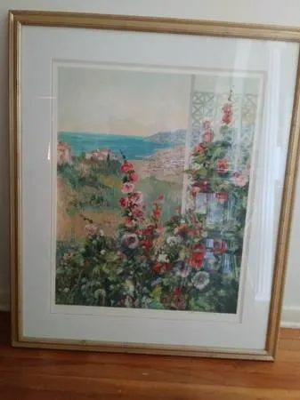 Hollyhocks by Henri Plisson is an original serigraph, signed and numbered and with an archival frame. This means that all materials that touch the work of art are non-acidic. Being an original serigraph, the creation process lays paint on the paper so the image has a vivid color presence that you wont see in signed and numbered offset lithography collector prints. The framed size is 42.5 inches x 36 inches. The image size is 30 x 24 inches. $150.The frame cost over $300 My house is near S. Alameda and Doddridge. Call 361-488-4367.