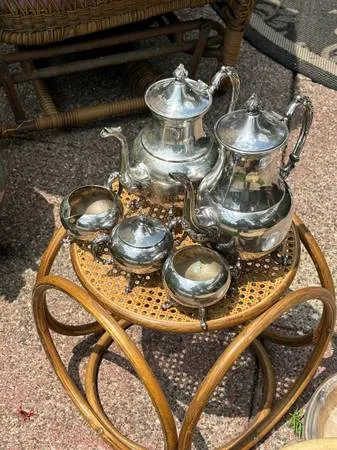 Up for sale is an Antique 5-Piece Silver on Copper Teapot Set in Good Condition for its age. $200 Firm takes it. *Sold As Is/No Returns*. It is located in Fair Lawn, NJ. Call me at 862-202-4944 if interested.