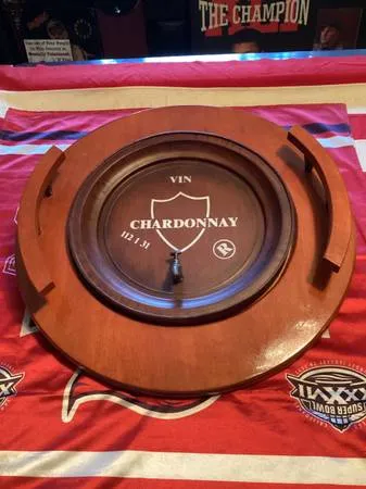 Round Chardonnay Tray/Wall Hanger approximately 25 in Diameter, has 16 Metal Center with 25 Diameter surrounding Wood and a Spout in Excellent Condition for Sale for ONLY $40.00. If interested, please call 407-505-0562, leave a message, and I will immediately return your call. Thank you and have a nice day.