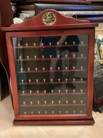 Red Mahogany Wooden Display Case holds 63 Prized Golf Balls on Tee, measures 21 Wide and 30 Tall in Excellent Condition for Sale for ONLY $95.00. If interested, please call 407-505-0562, leave a message, and I will immediately return your call. Thank you and have a nice day.