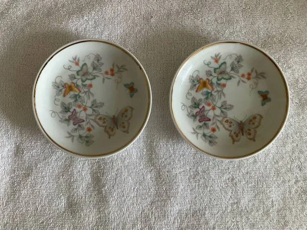 FOR SALE SET OF 21979 MINIATURE PLATES WITH BUTTERFLY AND FLOWERS DESIGN BY AVON FINE PORCELAIN HAND DECORATED WITH 22 K GOLD TRIM. PRODUCED IN BRAZIL ORIGINAL OWNER. FROM A PET FREE AND SMOKE FREE AND TEMPERATURE CONTROLLED HOME SERIOUS INQUIRES ONLY PLEASE. CALL OR TEXT 540-947-1631