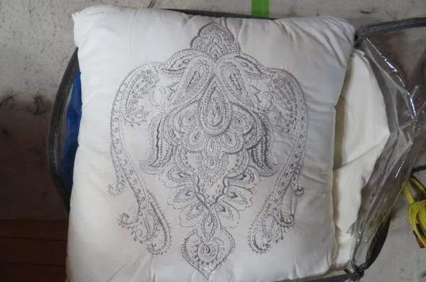 Includes comforter/bedspread, 2 pillow cases, base skirt, and accent pillow. Photo is of pillow...The comforter is mostly of same design, with areas of no design, just open off-white. Barely used - LIKE NEW! - $40 - CASH - FIRM - CALL 231-228-6218 * I may meet halfway to deliver between Maple City and Traverse City.