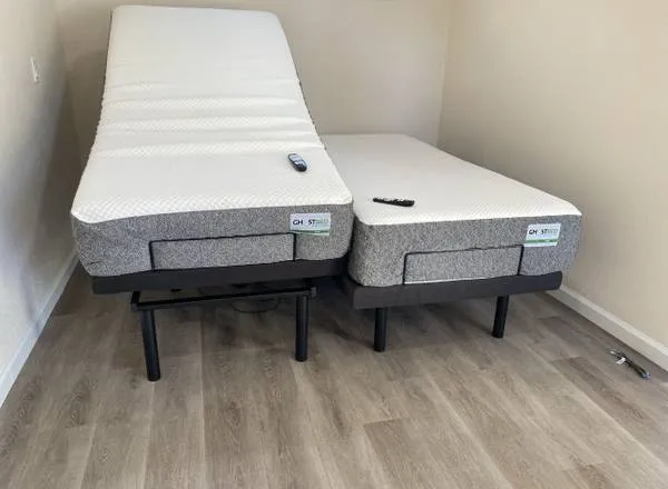 Ghost Bed 11 Split King Memory Foam Mattresses with adjustable bases ! The bases have many different options including 0 gravity and massage. This set has massage and 2 wireless remotes. The mattresses are a split king and each side can go up and down individually. Each side can lift up to 750 pounds per side. It is a king size bed which measures 76 inches wide, 80 inches long and the mattresses are 11 inches thick. Also known as an eastern king, euro king or regular king. It can be used as 2 twin XL beds. It can be used in different rooms. It has removable washable covers. This bed has great reviews. Retails for $3,233 plus tax. I am only asking $1,700 and I will deliver it for free. I will even set them up if needed. I can also remove your old bed for free up to 100 miles if needed. 916-585-0407