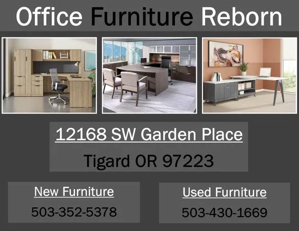 Office Furniture Reborn Residential - Small Business - Corporations Featuring a Wide Selection of New & Used Filing Cabinets! To see pictures and pricing of what we have to offer, click the more ads by this user . Our Showroom is Open to the Public! Visit Our Showroom or Place your phone Orders! ------------------------------------------------------- We Offer New & Used Office Furniture Check out our Showroom... Office Furniture Reborn Park 217 Business Center 12168 SW Garden Place Tigard OR 97223 503-352-5378 / Sales Team Monday - Friday 8:00 - 6:00 Saturday 8:00 - 5:00 SundayClosed Website - www.officefurniturereborn.com Facebook - https://www.facebook.com/officefurniturereborn Instagram - https://www.instagram.com/officefurniturereborn ------------------------------------------------------- Office Furniture Reborn We are a company that specializes in offering New & Used Office Furniture that is in great condition at a fair price. We are working diligently to increase our selection so we can bring more options to you. At this time, you will find us a great resource for established businesses, small companies just getting started and when an existing company is adding some new employees. We can also help with your home office. Need just 1 desk...? Need to setup an entire buisness office...? Give us a call... We would love to assist you. Office Furniture Reborn 503-352-5378 Website - www.officefurniturereborn.com Facebook - https://www.facebook.com/officefurniturereborn