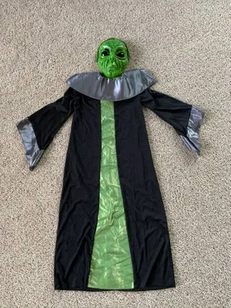 Green Alien in Cloak - Halloween Costume / Dress Up - Kid Size Medium Includes Robe, Collar and Face Mask Seam near collar on right side is pulled apart a bit, but is covered by the silver collarsee last pic. Text me at 720-432-5337 Cash only please. Porch pick up in Broomfield, or able to meet in most areas between Highlands Ranch and Estes Park