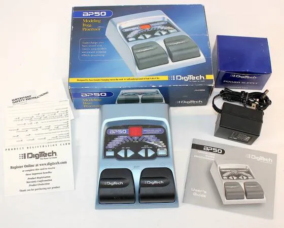 Like new in box with instructions. Lots of fun. Meet the newest member of Digitech’s bass modeling floor processor line — the new feature-packed Digitech BP50 Bass Multi-Effects Processor. Their bass guitar-freak engineers built the BP50 with the great tone and effects you expect from DigiTech, including award-winning amp and cabinet modeling plus an arsenal of studio- quality effects designed specifi cally for the bass. The BP50 uses an AudioDNA DSP chip to ensure that both modeling and effects are world-class. Plus, 24-bit A/D/A converters ensure accurate tonal reproduction between inputs and outputs. And when Digitech wasn’t looking, their fanatical engineers even snuck in a drum machine with 30 patterns, adjustable tempo and an easy-to-use 13-LED-array tuner. Then we made sure that the BP50’s user interface was so simple a drummer could operate it (well most drummers, anyway). If you’ve drooled over the bigger BP Series models but didn’t have that much cash in your jeans, get on down to your DigiTech dealer and score a BP50. Features: * 11 Amp Models * 5 Stompbox Models * Cabinet Modeling * 19 Effects * Fully programmable * 24-bit A/D/A * Rhythm Trainer: 30 patterns * Chromatic tuner Effects: * Amp & Cabinet Modeling * Programmable 3-band EQ * Fretless Simulator * Digital Delay * Analog Delay * Ping Pong Delay * 6 Reverbs * Detune * Pitch Shift * Chorus * Flanger * Phaser * Octavider * Vibrato * Synth Talk * Silencer Gate * Auto Swell * Compression with variable crossover * Envelope Filter * Wah * Whammy