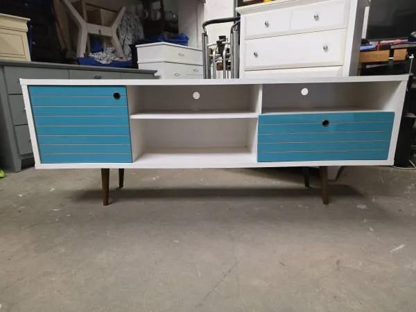 Selling a nice MCM style white and blue tv stand or media cabinet in excellent condition all around. Measures 71 inches wide, 26 tall and 15 deep. Please call or text me at 631-796-2729 if youre interested. Thank you.