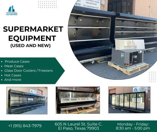 USED SUPERMARKET EQUIPMENT! Whether you own or are planning to open a supermarket, we have you covered. Come and take a look at our IN STOCK supermarket equipment. From refrigerated display cases, glass door coolers/ freezers, meat market equipment, bakery equipment. We have wat you need! The best part, we have the best prices in town! Equipment: -Dairy Cases -Produce Cases and Display Produce Cases -MultiDeck Cases -Meat Casesstraight and curve glass -Glass Door Freezers and Coolers 5,4, and 2 doors -Ice Machines -Deli Cases -Display Bakery Cases -Display Islands -Under the Counter Bar Coolers Come and visit us in 605 N Laurel St. Suite C Call us 915-843-7979 ¡EQUIPO DE SUPERMERCADO USADO! Si tiene o planea abrir un supermercado, lo tenemos cubierto. Venga a ver nuestro equipo de supermercado EN EXISTENCIA. Desde vitrinas refrigeradas, refrigeradores/congeladores con puerta de vidrio, equipos para carnicería y panadería. ¡Tenemos todo lo que necesita! ¡Y lo mejor, tenemos los mejores precios de la ciudad! Equipo: - Vitrinas para lácteos - Vitrinas para frutas y verduras y vitrinas de exhibición - Vitrinas multipisos - Vitrinas para carnevidrio recto y curvo - Congeladores y refrigeradores con puerta de vidrio 5, 4 y 2 puertas - Máquinas de hielo - Vitrinas para charcutería - Vitrinas de exhibición para panadería - Islas de exhibición - Refrigeradores de barra bajo mostrador Visítenos en 605 N Laurel St. Suite C Llámenos al 915-843-7979