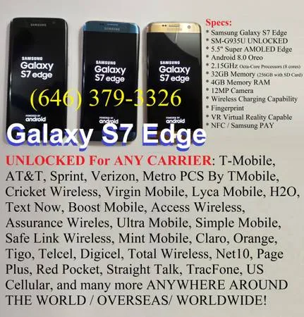 This is a FULLY UNLOCKED Samsung Galaxy S 7 Edge. 5.5 Display, 32 GB expandable with MicroSD card, 4 GB RAM, NFC, Wireless Charging, and moreLike S 8, S 9, S 10. Pickup in the Bronx, NY by Fordham Road and Jerome Avenue. CASH ONLY! Please text me any time 646-379-3326. Thanks for looking!