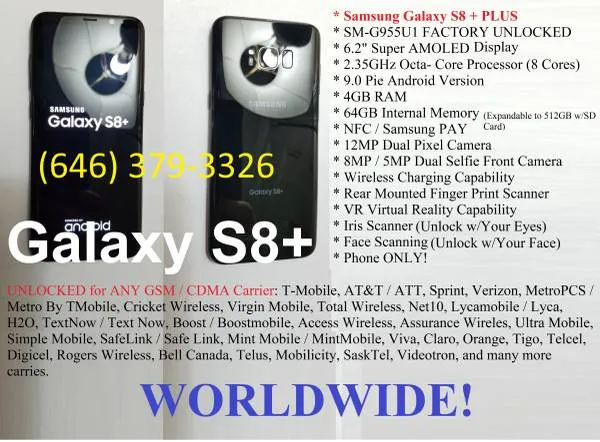 This Samsung Galaxy S 8 Plus SM-G 955 U UNLOCKED smartphone has 6.2 Super AMOLED display, 64 GB expandable, 4 GB, wireless charging, fingerprint, 12 MP camera, Android 9.0 Pie, and moreS 9 S 10. UNLOCKED for any carrier T-Mobile, Mint Mobile, Simple, Lycamobile, Ultra, MetroPCS, AT&T, Cricket Wireless, H 20, Verizon, Page Plus, Net 10, Visible, Sprint, Boost, and more. CASH ONLY! Pickup in the Bronx. Please TEXT me at 646-379-3326. Thanks for looking!