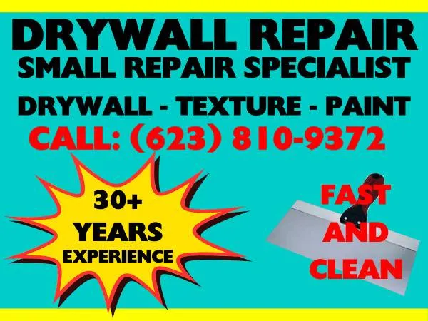 623-810-9372 DRYWALL REPAIRS SERVICE . PAINT SPECIALS DOGGIE DOOR STUCCO REPAIR . handyman DRYWALL PAINT LITE FRAMING BACKING REPAIR. STUCCO REPAIR LIKE DOGGIE DOORS HANDYMAN.! SPECIALIST DRYWALL REPAIR EXPERT! 6238109372 THANKS WATER DAMAGE INSURANCE CLAIMS DRYWALL AN PAINT RICKS DRY⁷WALL REPAIRS. HOUR RATE ON JOBS 35 yrs Exp PROFESSIONAL LICENSED BONDED INSURED . 623-810-9372, WORK IS GUARANTEED WATER DAMAGE INSURANCE CLAIMS DRYWALL AN PAINT REPAIRS 35 YRS EXP INSURED DRYWALL REPAIRS SERVICE TEXTURE MATCH, EXCELLENT PATCHING REPAIRS . SERVICE OFFERED. WATER HEATER REPLACEMENTS ALL DRYWALL REPAIRS WATER DAMAGE DRYWALL HANDYMAN SERVICE REPAIRS SMALL REPAIRS REPIPE REPAIRS.LIGHT FRAMING WITH DRYWALL INSTALLED . CRACKS,SEAMS,FLOAT ALL DRYWALL REPAIRS. LEVEL 5 FINISHES COMMERCIAL / RESIDENTIAL. PHX SCOTTSDALE SURPRISE WEST VALLEY BUCKEYE SOUTH SCOTTSDALE THE SUN CITYS WEST,GRAND SUNCITY