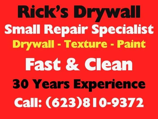 623-810-9372 DRYWALL REPAIRS SERVICE . PAINT SPECIALS WATER DAMAGE INSURANCE CLAIMS DRYWALL AN PAINT RICKS DRY⁷WALL REPAIRS. HOUR RATE ON JOBS WATER DAMAGE DRYWALL HANDYMAN SERVICE REPAIRS SMALL REPAIRS REPIPE REPAIRS.LIGHT FRAMING WITH DRYWALL INSTALLED . CRACKS,SEAMS,FLOAT ALL DRYWALL REPAIRS. LEVEL 5 FINISHES COMMERCIAL / RESIDENTIAL. . 623-810-9372, WORK IS GUARANTEED WATER DAMAGE INSURANCE CLAIMS DRYWALL AN PAINT REPAIRS 35 YRS EXP DRYWALL REPAIRS SERVICE TEXTURE MATCH, EXCELLENT PATCHING REPAIRS . SERVICE OFFERED. WATER HEATER REPLACEMENTS ALL DRYWALL REPAIRS WATER DAMAGE DRYWALL HANDYMAN SERVICE REPAIRS SMALL REPAIRS PHX SCOTTSDALE SURPRISE WEST VALLEY BUCKEYE SOUTH SCOTTSDALE THE SUN CITYS WEST,GRAND SUNCITY