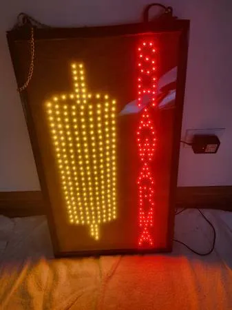 Very gently used and in excellent condition. It is approx. 15.5 in on length, 26 in in h 8.and 1 in in width. Comes with power cord and metal.hanging rope. The lights flash or are steady. There is a slight indentation at the top which is not noticeable when hanging and does not affect usage. Originally purchased for $329. Cash n carry. Call 630-965-2056.