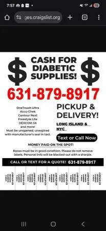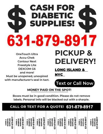 CASH CASH CASH We buy unopen unexpired and undamaged diabetic supplies. We offer free pick-up and delivery in Nassau, Suffolk, and Westchester counties Reach us at 631-879-8917 Brad or Alex