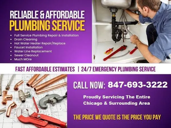 The plumbing in your home is essential to your everyday life. The basics of clean water and collection of waste is dependent on clear running pipe lines and a properly installed plumbing system. No matter the size or complexity of the plumbing job, our qualified plumbing technicians can get it d 1 right. whether its a small repair or a major system upgrade we will get it taken care of quickly and effectively. Well always be upfront with our pricing so there wont be any surprises, just clear communication and an informative approach. Our courteous, experienced team will always treat your home with respect while ensuring your homes plumbing system continues to run at its peak. ☎️ Call us 24/7847-693-3222 for Reliable & Affordable Plumbing Service -Plumbing Repair and Installation D 1 Right the First Time -Fully Written Estimates-No Hidden Fees -We service the entire Chicago and Surrounding Area -24/7 Emergency Plumbing Repairs -Both Residential and Commercial Plumbing Services Our Plumbing Services Include: Plumbing Repairs Faucets and Fixture Repair Pipe Inspection Garbage Disposals Garbage Disposal Repair Garbage Disposal Replacement Water Heater Repair Tankless Water Heater Installation Toilet Repair Toilet Installation Toilet Replacement Water Softener Installation Water Heater Installs Hot Water Heater Repair Water Meters Sewer Lines Sink Unclogged Shower Repair Tub Replacement Slab Leak Repair Shut Off and Spickets Gas Lines Repairs Installs Non-Invasive Sewer Cleaning Video Sewer Inspection Hydro-Jetting Services Septic Pumping Sewer and Drain Cleaning And Much More! ☎️ Call 847-693-3222 For Reliable Plumbing Service