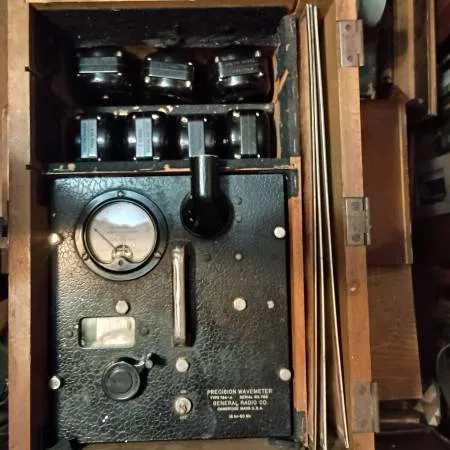 Presision Wavemeter Type 724-A. Unit is in good to excellent condition overall with some wear and scratches,top half of lid latch is missing. Box latch has original key attached to top of box lid.Comes with 7 Bakelite coils, calibration charts, and instruction charts all dated in 1940 s Asking $350 o.b.o. if interested you can contact me at 210-331-4210 serious inquiries only please Type 724-A Serial: 768 16 kc-50 Mc Bakelite coils 0.5-500 Mcall have serial 768 Charts: Form 417 c, 417 e, 417 dall dated 6/14/1948