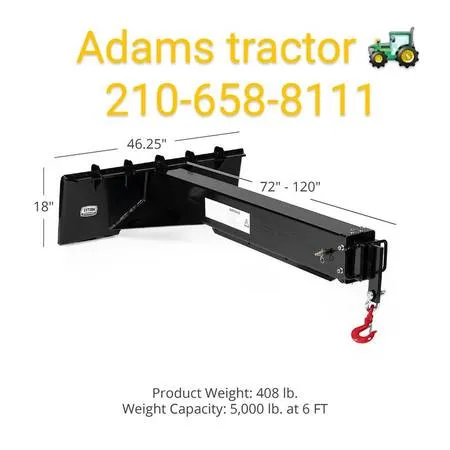 Non hydraulic sliding boom 2099.00 Shown in the photos 1,234 Also available 20 foot hydraulic boom for only $3099.00 This hydraulic boom shown in Photos 5,6,7,8 Heres details on the non hydraulic telescoping boom Adjustable Hoist Jib Boom Crane lets you lift heavy loads easily. This attachment is especially advantageous if you work in a warehouse or factory. This mobile crane is available for skid steer loaders or tractors equipped with the SSQA or Universal Skid Steer Style Quick Tach System and is made to support a load capacity of up to 5,000 LB so that you can pick up plenty of materials and containers. The boom telescopes from a starting length of 72 to 120, allowing you to lift higher and place your payload further than you have ever been able to. The crane is built sturdy and can withstand 1,000 LB of capacity at its full extension of 10 FT. Attach the frame to your skid steer, hook it to your payload, and quickly move heavy equipment and other material around your construction site or shop. The 75-degree built-in angle will maximize rollback. ALSO AVAILABLE NUMEROUS ATTACHMENTS FOR SKID STEER LOADERS, AT GREAT PRICES FITS MOST ANY SKID STEER BOBCAT CAT CASE NEW HOLLAND KUBOTA GEHL JOHN DEERE MUSTANG TAKEUCHI AUGERS POST HOLE Bobcat ATTACHMENTS BOBCAT JOHN DEERE CAT CASE NEW HOLLAND GEHL MUSTANG KUBOTA TAEKUCHI SKIDSTEER LOADER SKID STEER CALL ME TO DISCUSS YOUR PERSONAL AND BUSINESS NEEDS.... THANKS TIM ADAMS, OWNER. 210-658-8111 FEEL FREE TO COME OUT AND DEMO IN MY GIANT DEMO SITE. TRY IT OUT FOR YOURSELF, INSTALL ATTACHMENTS TO SEE WHAT IT IS CAPABLE OF DOING AS WELL, THIS UNIT WILL IMPRESS YOU .... SAVE YOU VALUABLE TIME, AND MAKE YOU M 1 Y AUGERS-BITS-EXTENSIONS-ROCK BITS GRAPPLE RAKES- BACKHOE ATTACHMENTS- BOOM ATTACHMENTS- ROCK SAWS- MOWERS- UTILITY MOWERS- BRUSH CUTTERS- TIRES -AND -RIMS -WHEELS- TRACKS- ADVICE, FREE- GRAPPLE BUCKETS- SMOOTH BUCKETS- TEETH BUCKETS- PALLET FORKS- STUMP BUCKETS- TRENCHERS- ROCK GRAPPLES- MULCHERS- TRAILER MOVERS-QUICK HITCH RECEIVERS- ROOT PLOW- GRUBBERS- SKELETON BUCKETS- QUICK HITCH TRACTOR ADAPTERS - DOZER BLADES- STUMP GRINDERS- BROOMS- PICKUP BROOMS- HAY SPEARS- SOLID FLEX TIRES AND RIMS SYSTEMS- BLANK QUICK HITCH PLATES,-USED TO BUILD YOUR OWN ATTACHMENTS, OR REPAIR EXISTING ATTACHMENTS- CAN EASILY GET IT QUICKLY IF WE DO NOT HAVE ITEMS IN STOCK, WE REPRESENT MULTIPLE VENDORS REMEMBER PROPER EQUIPMENT INCREASES PRODUCTIVITY and IMPROVES YOUR PROFITABILITY Many Repeat Customers--- WE ARE HERE FOR LONG HAUL, TO MEET YOUR NEEDS Today AND Tomorrow WE HAVE BEEN PROUDLY SERVING TEXANS WITH SKID STEER LOADERS, AS WELL AS GOOD QUALITY ATTACHMENTS over 25 years! BANK FINANCING POSSIBLE , FOR QUALIFIED BUYERS PRICE DOES NOT INCLUDE TAXES, Tax EXEMPTIONS ARE GLADLY ACCEPTED WITH PROPER DOCUMENTS PROVERBS CHAPTER 16 VERSE 3, COMMIT YOUR ACTIONS TO THE LORD AND YOUR PLANS WILL SUCCEED, GOD BLESS TIM ADAMS FEEL FREE TO COME OUT AND DEMO IN MY GIANT DEMO SITE. TRY IT OUT FOR YOURSELF, INSTALL ATTACHMENTS TO SEE WHAT THE BOBCAT IS CAPABLE OF DOING AS WELL, THIS UNIT WILL IMPRESS YOU .... SAVE YOU VALUABLE TIME, AND MAKE YOU M 1 Y AUGERS-BITS-EXTENSIONS-ROCK BITS GRAPPLE RAKES- BACKHOE ATTACHMENTS- BOOM ATTACHMENTS- ROCK SAWS- MOWERS- UTILITY MOWERS- BRUSH CUTTERS- TIRES -AND -RIMS -WHEELS- TRACKS- ADVICE, FREE- GRAPPLE BUCKETS- SMOOTH BUCKETS- TEETH BUCKETS- PALLET FORKS- STUMP BUCKETS- TRENCHERS- ROCK GRAPPLES- MULCHERS- TRAILER MOVERS-QUICK HITCH RECEIVERS- ROOT PLOW- GRUBBERS- SKELETON BUCKETS- QUICK HITCH TRACTOR ADAPTERS - DOZER BLADES- STUMP GRINDERS- BROOMS- PICKUP BROOMS- HAY SPEARS- SOLID FLEX TIRES AND RIMS SYSTEMS- BLANK QUICK HITCH PLATES,-USED TO BUILD YOUR OWN ATTACHMENTS, OR REPAIR EXISTING ATTACHMENTS- CAN EASILY GET IT QUICKLY IF WE DO NOT HAVE ITEMS IN STOCK, WE REPRESENT MULTIPLE VENDORS REMEMBER PROPER EQUIPMENT INCREASES PRODUCTIVITY and IMPROVES YOUR PROFITABILITY Many Repeat Customers--- WE ARE HERE FOR LONG HAUL, TO MEET YOUR NEEDS Today AND Tomorrow WE HAVE BEEN PROUDLY SERVING TEXANS WITH SKID STEER LOADERS, AS WELL AS GOOD QUALITY ATTACHMENTS over 25 years! BANK FINANCING POSSIBLE , FOR QUALIFIED BUYERS PRICE DOES NOT INCLUDE TAXES, Tax EXEMPTIONS ARE GLADLY ACCEPTED WITH PROPER DOCUMENTS PROVERBS CHAPTER 16 VERSE 3, COMMIT YOUR ACTIONS TO THE LORD AND YOUR PLANS WILL SUCCEED, GOD BLESS TIM ADAMS BOBCAT CAT CASE NEW HOLLAND GEHL MUSTANG JOHN DEERE KUBOTA TAKEUCHI SKIDSTEER LOADER LAND CLEARING- CEDAR REMOVAL, CLEARING STUMP REMOVAL TREE REMOVAL SKIDSTEER LOADERS ROAD REPAIRS-MAINTENANCE, TANK BUILDING HAY MOVERS PASTURE RENAVATION LOT CLEARING THANKS YOU VERY MUCH FOR LOOKING TIM ADAMS Now Celebrating 23 Years in the Equipment Business ! Same Location Friendly Customer Service Quality Equipment and Accessories Knowledgeable Consulting Before the Sale Follow up and Support After the Sale After 23 Years We Must have been doing something Right? We Survived because of our Loyal New and Repeat Customers all these years and we THANK YOU ! We could not have reached this milest 1 without all the tire kickers and you, the buyers. We understand your hard earned m 1 y contributed to our being in Business for this long, and we are humble enough to recognize and appreciate YOU. Call me with questions thanks tim The Bible says, I will know you by your fruit. We Pray our Good Fruit keeps you returning and visiting us, here at Adams Tractor Sales. 10 Things We Learned Over the Years and Use in our Personal Life and Business Dealings 1 Its not what a person says but what he does that truly defines him. Dont believe everything you hear about some 1, take a good look at their fruit. 2 Dont waste your time defending the lies about you. Focus on the Truths. Gods Got this. 3 Doing whats right creates instant and everlasting peace. Doing whats wrong creates a lifetime of misery. Gods always watching. 4 Being Nice takes way less energy than being ugly. 5 Show me your friends, and I will show you your future. Do you have a Friend in Jesus? 6 H 1 sty