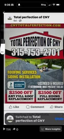 FACTORY-DIRECT WHOLESALE PRICING! Roofing , Siding Deals – Syracuse , Central NY 🏠 Save BIG Before Winter Hits! ✅ SAVE $2,000 on any Full Roof Replacement 15 sq or more ✅ Or SAVE $2,000 on any New Siding Job 📦 Stock colors only – while supplies last! Lifetime Warranty on Materials 15-Year Labor Warranty Licensed • Insured • Locally Trusted 📞 Call Now:315-753-2701 🌐 Visit: TotalPerfectionofCNY.org 📧 Email: roofingsrvc 1996 gmail.com 💥 End of Season = End of Inventory! Don’t Miss Out! Total Perfection of CNY – Quality. Integrity. Total Perfection.