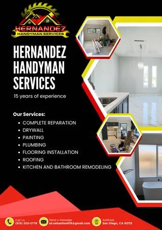 - Complete Repairs - Dry Wall - Commercial and residential Painting - Plumbing - Fooring Installation - Roofing - Kitchen and Bathroom Remodeling Quickly and Free estimate. References upon request. Experienced, affordable, reliable. Call or text anytime, 24/7, Miguel:619-205-2778 15 years of experience Se habla Español Check my Page: https://hernandezhandymanservicesca.com/ https://ezlocal.com/ca/san-diego/handyman/0917785924 https://www.merchantcircle.com/hernandez-handyman-service 2-san-diego-ca https://www.manta.com/c/m 1 wwzx 7/hernandez-handyman-service https://www.yelp.com/biz/hernandez-handyman-service-san-diego-3 My work areas: San Diego, Chula Vista, Escondido, Poway, San Marcos, Santa Fe, El Cajon, more. Our Services: Complete Repairs, Dry Wall, Commercial and residential Painting, Plumbing, Fooring Installation, Roofing, Kitchen and Bathroom Remodeling, more