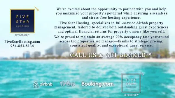 ⭐⭐⭐⭐⭐ Are you ready to maximize your propertys potential, while ensuring a seamless and stress-free hosting experience? If you answered YES--Great! 5 Star Hosting specializes in full-service Airbnb property management, tailored to deliver both outstanding guest experiences and optimal financial returns for property owners like yourself. CALL US TODAY & GET BOOKED™ 954-853-8134 5 StarHosting.com ⭐⭐⭐⭐⭐