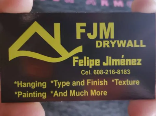 FJM DRYWALLLLC 23 YEARS THE EXPERIENCE _ DRYWALL INSTALLATION AND REPAIR _ TAPING AND FINISHING _ TEXTUREORANGE PEELSAND TEXTUREKNOCKDOW TEXTURE _ PAINTING _ DEMOLITION _ COMERCIAL OR RESIDELTIAL FELIPE JIMENEZ 608-216-8183 CALL OR TEX ANY TIME