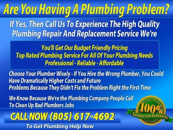 Call 805-617-4692 Serving Ventura and the surrounding area You Can Sleep Well At NightKnowing Well Get It D 1 Right You will get our package of plumbing installs and repairs at our competitive pricing We fix the job right the first time In factwe have cleaned up plenty of messes created by so called plumbers so be careful in choosing the right plumber Protect yourself and your homeHire A Professionialexperiencedtop ranked with a proven track record plumbing business Call us 805-617-4692 Some of our services: Toilet Replace and Repair Water Heater installation & Repair Toilet RepairInstall Regulator Garbage Disposal Installation Tankless Water Heater System Water Heater Installation Installation of gas shut Gas Leak Detecting and Repaired Toilet & urinal repair or replacement Copper Repipe and Repair Sewage system Bathroom Sink Rooting Rooter Drain cleaning Hot Water Recirculation System Water heater repair or replacement Garbage disposal repair or replacement Leaky Faucet Water Heater installation & Repair Hot Water Recirculation System Full Service Plumbing and Drain RepairsCommercial Faucet Installation Kitchen faucet repair or replacement Rooter services Appliance installations Bathtub Rooting Master plumber at affordable price water pipes Low flow toilets Drain Clogs Hydro Jetting Service Sewer Lines Installed and Repaired Water filtration systems Water Line Service Backflow anti Backflow prevention 91301913209136091361913629137793001930039300493010930139301593021930239303093033930359303693041930609306393066930949310193111931179313093301 Camarillo Fillmore Moorpark Newbury Park Oak Park Oak View Ojai Oxnard Piru Port Hueneme Santa Paula Simi Valley Somis Thousand Oaks Ventura Westlake Village