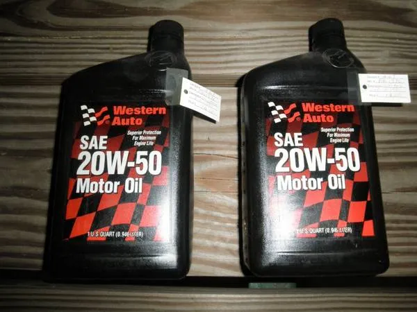 2, Kansas City, Missouri Western Auto 20-50 motor oil, 1 quart, black plastic bottles, never opened, printed labels, new old stock, circa 1985, pair, 816-229-6500