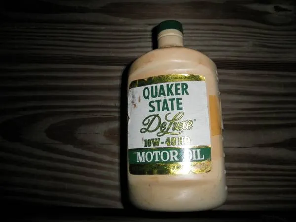 deluxe 10-40 motor oil, 1 quart, white plastic bottle, never opened, paper labels, new old stock, circa 1985, 816-229-6500