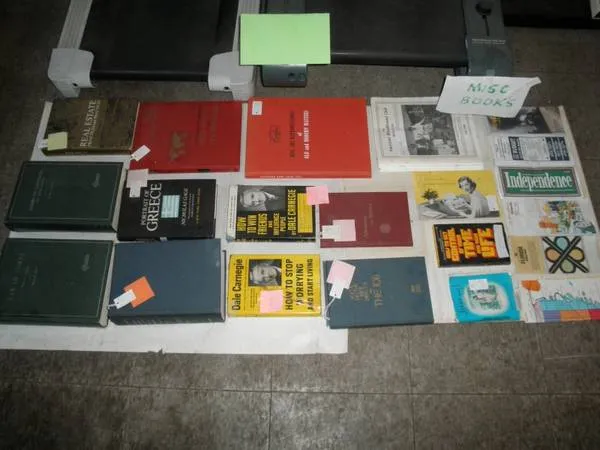 Law horn/text, law legal forms, real estate investment, Dale Carnegie classics, ar 2 rk, Rotary International, board of directors, religious, self improvement, IBM typewriter owner manual, bloodhound club magazines, 6 old road maps, 816-229-6500