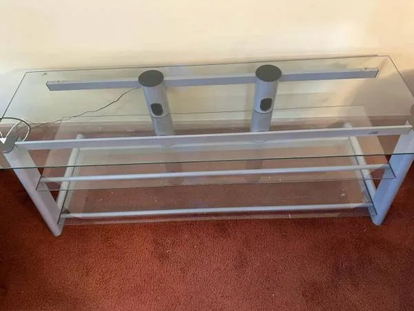 3 Level entertainment center. 3 shelves made of 3/8 tempered glass. Very solid well built unit. 63 W x 22 D x 191/2 H. Has been taken apart for transport. 360-691-7254