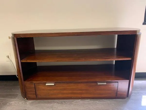 This low shelf is very sturdy…can support some heavy art or lots of books. It’s also very attractive with curves on each end. It is open in the back and the drawer works well. There is a bit damage on the top, as you can see in the photos. Measurements: 55 inches wide 18 inches deep 30 inches high If you have questions or would like to come take a look, call Sandy 503-970-6985.