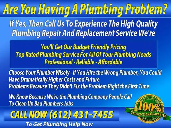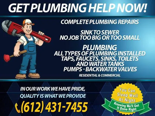 Call 612-431-7455 Serving Minneapolis and the surrounding area. You Can Sleep Well At Night - Knowing Well Get It D 1 Right You will get our package of plumbing installs and repairs at our competitive pricing. We fix the job right the first time. In fact, we have cleaned up plenty of messes created by so called plumbers so be careful in choosing the right plumber. Protect yourself and your home - Hire A Professionial, experienced, top ranked with a proven track record plumbing business. Call us - 612-431-7455 Some of our services: Toilet Replace and Repair Water Heater installation & Repair Toilet Repair/Install Regulator Garbage Disposal Installation Tankless Water Heater System Water Heater Installation Installation of gas shut Gas Leak Detecting and Repaired Toilet & urinal repair or replacement Copper Repipe and Repair Sewage system Bathroom Sink Rooting Rooter Drain cleaning Hot Water Recirculation System Water heater repair or replacement Garbage disposal repair or replacement Leaky Faucet Water Heater installation & Repair Hot Water Recirculation System Full Service Plumbing and Drain Repairs, Commercial Faucet Installation Kitchen faucet repair or replacement Rooter services Appliance installations Bathtub Rooting Master plumber at affordable price water pipes Low flow toilets. Drain Clogs Hydro Jetting Service Sewer Lines Installed and Repaired Water filtration systems. Water Line Service Backflow / anti Backflow prevention 5401654017540225402554302547015500955011550145501655024550255503355038550405504255044550465505555056550575506055065550665506855070550715507555076550775508855101551025510355104551055510655107551085510955110551125511355115551165511755118551195512055121551225512355124551255512655127551285512955130551995530155303553045530555306553095531155313553155531655317553185532755330553315533755340553415534355344553455534655347553555535655359553645536855369553725537455375553765537855379553875539155397553985540355404554055540655407554085540955410554115541255413554145541555416554175541855419554205542155422554235542455425554265542755428554295543055431554325543355434554365543755438554395544155442554435544455445554475544855449554545575355806559015590256257563015630456387 Andover Anoka Apple Valley Apple Valley Big Lake Blaine Bloomington Bloomington Brooklyn Center Brooklyn Park Brooklyn Park Buffalo Burnsville Champlin Chanhassen Chanhassen Chaska Columbia H 8 s Coon Rapids Cottage Grove Crystal Eagan Eagan East Bethel Eden Prairie Eden Prairie Edina Edina Elk River Falcon H 8 s Farmington Forest Lake Fridley Golden Valley Golden Valley Ham Lake Hastings Hopkins Hopkins Hudson, Wisconsin Hugo Inver Grove H 8 s Lake Elmo Lakeville Lakeville Lino Lakes Little Canada Maple Grove Maple Grove Maplewood Medina Mendota H 8 s Mendota H 8 s Minnetonka Minnetonka Monticello Mounds View New Brighton New Hope North Branch North St. Paul Oakdale Otsego Plymouth Plymouth Prior Lake Ramsey Richfield River Falls, Wisconsin Robbinsdale Robbinsdale Rogers Rosemount Roseville Roseville Savage Shakopee Shakopee Shoreview Shoreview South St. Paul St. Anthony St. Louis Park St. Louis Park St. Michael St. Paul Stillwater Vadnais H 8 s Victoria Waconia West St. Paul White Bear Lake Woodbury Woodbury