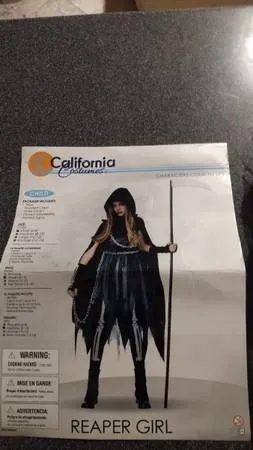 The Halloween costume reaper girl in child size small 6 to 8 is a cute and fun outfit perfect for young girls to celebrate the Halloween season. Made of polyester with elastic/stretch features, this costume from China is designed to be comfortable and flexible for active children. The reaper girl theme adds a spooky touch to the costume, making it a fun and unique choice for Halloween parties or trick or treating activities. Prices $25 call Jason to arrange for pickup 805-404-0895 no email ple...