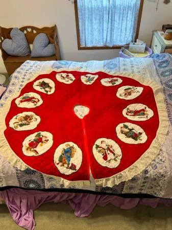 Hand made Vintage Xmas tree skirt. Approx 58 inches. Has Vintage Santa Claus’s on it! Lace around edges! Perfect condition. Buyer must pick up 330-787-1401 —leave message if unable to pick up. Cash only