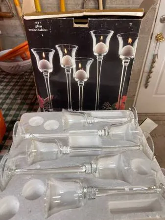 10.00 total for BOTH BOXES! Selling as a set! New still in box! Flared Tulip ..w/ tapered stems! 89101112 BOTH BOXES! 2 sets ! 5 candle holders in each box! Buyer must pick up Calls/ texts 330-787-1401