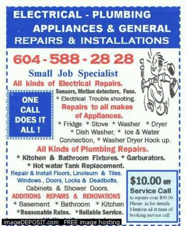 We Do Any kind # Electrical # Plumbing # Appliances & ALL GENERAL REPAIR & INSTALL No Job TOO Small Or TOO BIG BIG Or Small WE DO IT ALL We Do All General Repairs * Reasonable Rates ** Prompt Service All work performed by Experienced Personal. & GAURANTEED. phone 604537. 4818 No Voice or Text messages We service. Almost Everywhere. All makes & models phone 604-537-4818. No voice or Text messages Special Sale Dishwasher Installation For $ 99:00 + We install all kinds of Dishwashers & appliances for 1 LOW. PRICE ONLY. $. 99:00 + We can also pick up the New Dishwasher or any appliance or Fixture from the store. Deliver it to your Home or Business. Supply all Nessassary parts needed to Install and also Dispose the old Dishwasher , appliances or Fixtures @ a Charge. The Sale price is for labor to install does not include parts, S/c or any of extra Services. phone 604-537-4818. No voice or Text messages We also install All kinds of ice and water * Fridges, Washer,Dryer Garburetors etc. We do LAUNDRY ROOMS All Electrical, Plumbing, Venting Nessassary for Washer , Dryer Laundry Room Sink Install & assemble any kind of appliance Installation. phone 604-537-4818. No voice or Text messages We install All Kinds of Appliances # Fridges # Stoves # Washers # Dryers # Dishwashers # Garburetors . Electrical Fixtures # Light Fixtures # Sensor Lights # Ceiling and Bathroom Fans # Over Range Microwaves # Fan Hoods. # Chandelier phone 604-537-4818. No voice or Text messages Plumbing Fixtures . # Kitchen and Bathroom Sinks , Faucets # Garburetors # Dishwashers We can run a water line for your Ice and water Fridge. We can Install a custom Dishwasher in a kitchen even if there is no spot for Dishwasher and blend in the cabinets Into the existing kitchen cabinets. Also available Brand New Kitchen and Bathroom Faucets $ 45:00 + with installation. Ceiling and wall light Fixtures $ 40:00 + With bInstallation. phone 604-537-4818. No voice or Text messages CUSTOM TUB & SHOWER DOORS Any Shape & Size