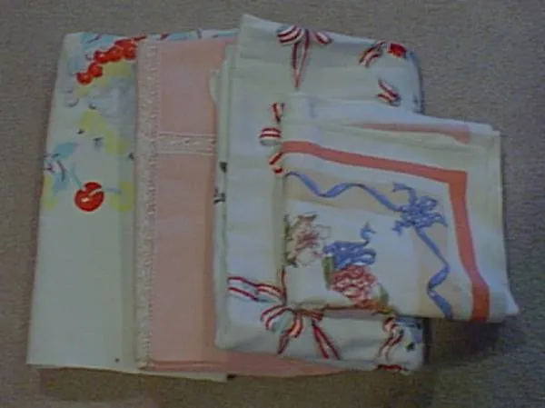 Please call if interested: 818-522-2555 Vintage 4 TABLECLOTHS - Large & Small - See Descriptions Good condition with a few light discolorations Have been stored since the 1950 s and not used in a smoke free / pet free home. 1 Pink with lace inserts and edges Measures 67 X 52 Couple of separations where the ace meets with the fabric 2. Cherries - Heavy Fabric Measures 72 X 57 Droplets / spatters mostly on the borders 3. Red Flowers with Red &...