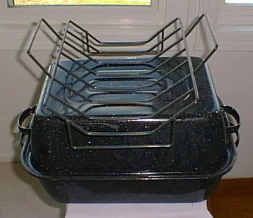 Please CALL if interested. 818-522-2555 . VINTAGE Blue & White Speckled Enamel Rectangular Roasting Pan W/ Lid I am including a large Non-Stick Heavy Duty Roasting Rack with handles that fits inside of the open Roaster Pan when the pan is not covered. Purchased but never used. Covered Pan Measures 17 x 12 and is pre-owned / used. It is not necessary to contact just to see if this item is still available. If you see this posting, it is available. This posting will be deleted i...