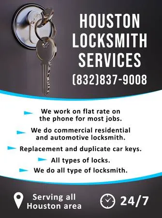 We do all type of locksmith in Houston and surrounding area Automotive, residential and commercial all types of locks and keys Car key replacement / duplicate Car lock out, house lock out Fresh installation business and residential Installation, replacement and repair doors Cutting, duplicating and programming car key Replacing locks, re-key all type of locks Safes, storage lock License and insured locksmith Call now:832-837-9008 We doing Car Keys service for the follow years: 1995, 1996, 1997, 1998, 1999, 2000, 2001, 2002, 2003, 2004, 2005, 2006, 2007, 2008, 2009, 2010, 2011, 2012, 2013. 2014, 2015, 2016, 2017, 2018, 2019, 2020,2021.2022,2023,2024,2025 Acura keys, Audi keys, BMW keys, Buick keys, Cadillac keys, Chevrolet keys, Chrysler keys, Dodge keys, Ford keys, GMC keys, Honda keys, Hyundai keys, Infinite keys, jaguar keys, Jeep keys, KIA keys, Land Rover keys, Lexus keys, Lincoln keys, Maserati keys, Mazda keys, Mercedes keys, Mercury keys, Mini Cooper keys, Mitsubishi keys, Nissan keys, Oldsmobile keys, Pontiac keys, Porch keys, Scion keys, Subaru keys, Toyota keys, Volkswagen keys