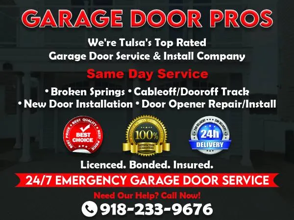 Local Dependable Garage Door Repair & Service Call us @ 918-233-9676 Emergency Service Available We cover the entire Tulsa area We Are Your Reliable And Professional Garage Door Repair and Installation Service Company. We Have Been Helping Residents of the Tulsa Area with their Garage Door Repair Problems and Solutions for over 10 years. We specialize in residential and commercial garage door and garage door opener repair and installation. Our highly trained technicians will arrive promptly to diagnose the problem, give you a price upfront, then fix the problem right then. You will receive an itemized invoice with a warranty. CALL US TODAY @ 918-233-9676 AND SAVE $$$!!! We Can Come Repair Or Replace your Garage Door At Any Hour Of The Day, On Any Day. It May Be A Simple Adjustment, Or A Major Repair Job, Either Way, We Will Show Up On Time With A Fully Stocked Truck, And Be Ready To Diagnose The Problem And Get Your Garage Door Fixed Right Then. Your Satisfaction It’s Always Our Number 1 Priority!!! Garage Door Repair Now Call 918-233-9676 Garage Door Spring Repair Residential Garage Construction Commercial Garage Builder Garage Builders Garage Construction Garage Remodel Garage Remodelers Garage Remodeling Garage Door Installation Garage Door Garage Door Repair Garage Door Replacement Residential Garage Door Repair Commercial Garage Door Repair Emergency Garage Door Repair 24 Hour Garage Door Repair Garage Door Opener Installation Emergency Garage Opener Repair Garage Opener Repair Garage Door Opener Adjustment Garage Door Opener Replacement 24 Hour Garage Opener Repair Garage Door Opener Residential Garage Opener Repair Commercial Garage Opener Repair