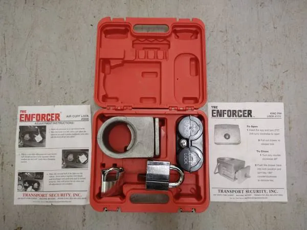 The Enforcer High Security Locking System... For Maximum Tractor, Trailer Cargo Security... Security Kit... Portable Lightweight Vinyl Case... Case Holds Locks & Seals For On The Road Security... Includes ABLOY 342 Shrouded Padlock, ABLOY 350 Padlock, King Pin Lock 1111 & Air Cuff Lock 3000... Air Cuff Covers & Locks The Air Valve Levers To Prevent Brakes From Release... $280... Please Call... 754.900.9455... Thanks...
