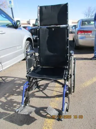 This INVACARE RECLINING WHEELCHAIR 9000 XT 250 LBS MAX 24 BACK H 820 X 18 SEAT used is in very good condition. In the pictures it shows the wrong footrests. You have your choice of the blue footrest shown or a new set of elevating footrests. The seat measures 20 wide, 18 deep and 23 tall without the extension headrest and 34 tall with it. The upholstery is good and the tires have some wear. It tilts smoothly. Call me if you are interested at 719-235-7309. DO NOT TEXT ME! I will not answer...