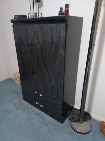 black with grayish-black front finish. 58 tall, 36 wide, 16 deep. adjustable shelf in upper portion. 650-380-2653