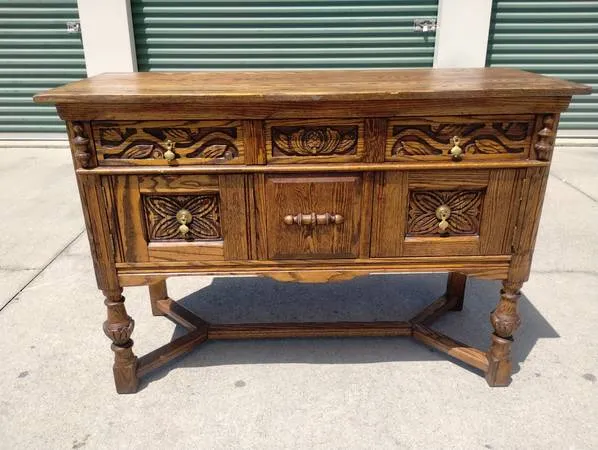 Antique Buffet with Stretcher Base. Jacobean Style. Beautiful Quartersawn Oak Wood. 1 Dovetail Jointed Drawer with Felt Lining and 3 Dividers. Original Handles. 2 Bottom Cabinets for Storage. Great for a Sideboard, Buffet, Server, Flat Screen TV Stand, etc. Beautiful Antique Piece in Like New Condition! Asking $375. Width - 52 Depth - 19.75 Height - 36 I can deliver for a small fee (depends on the location) We specialize in Cool Vintage Furniture. To see the other items I have listed, please do a search on Craigslist or Facebook using my phone number... 5241718. All of the items we have for sale are in our storage facility and here is the address... Cardinal Self Storage, 4200 Columbus Club Drive, Raleigh, 27610. Very Close to the Intersection of New Bern Ave and New Hope Road. Everything is shown by appointment. Cash, Venmo, Google Pay, Zelle, Cash App Accepted. No Personal Checks Please. Thanks for looking! Mike and Tanna Item #1824