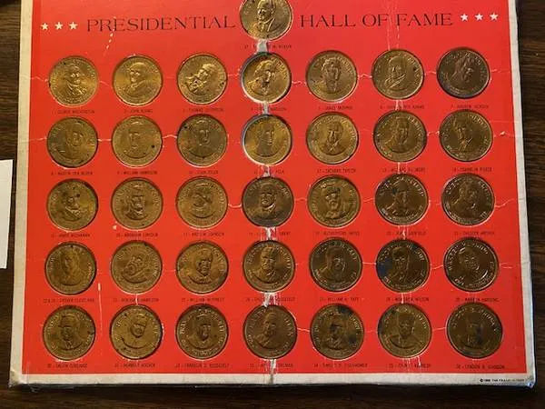 1968 Vintage Franklin Mint bronze Presidential coins. 36 coins plus 1 extra Andrew Jackson coin. Few coins are discolored. Holder has a few blemishes. Presidents George Washington to Lyndon B. JohnsonLBJ $15 cash only on pick up phone Calls only 315-567-1569 No texts or emails answered. They are deleted on arrival. Please call 315-567-1569 and leave a voice message if I cannot answer your calls while at work, leave your first name and phone number and I will call you back...