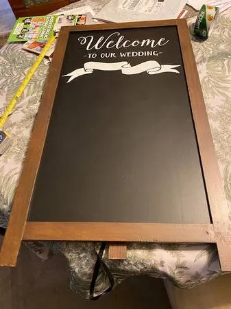 Welcome to Our Wedding Sign. Made of real wood, not plastic or particle board or plywood Chalk board with chalk included Stands upright with easel style leg. Made by Burnes of Boston See photos Real wood 30 tall x 17 wide with wooden stand to hold it up right. $40 cash on pick up, reduced from $50 No Venmo or Zelle or other cash apps. See photos 315-567-1569 phone Calls Only No texts or emails or crazy phone codes accepted , they are all deleted on arri...