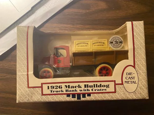 1926 Mack Bulldog Truck Bank with Anheuser - Bush crates. Made by ERTL in 1989. Made of Die cast metal. New in original box. Se photos $25 cash on pick up in Wolcott, CT at a public place. Calls Only 315-567-1569 No texts, emails, or No Caller ID answered, so please do not text, or email. phone calls only . Please leave a voice message with name and phone number if I am at work and cannot answer your calls. I will call yiou back on my work break if you do leave a vo...
