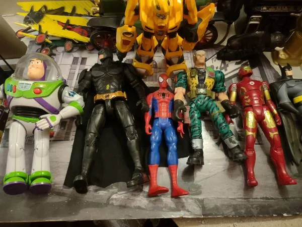 Includes 12 Inch Batman with Ironman, Transformer, Buzz Lightyear, Major Hazard. Major Hazard, Transformer, Buzz Lightyear, Ironman, 14 Inch Batman all take batteries and will talk.602-565-3497