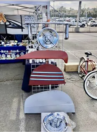 1956 CHEVY BELAIR PRIMER FENDER SKIRTS 220.00 A PAIR NEW RUBBER TRIM AND BRACKETS ATBUMPERS.COM 29699 PACIFIC ST HAYWARD CA 94544 CALL 510-881-1886 FREE T=SHIRT WITH PURCHASE